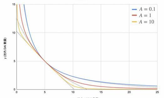 當k=0時,就是剛兌,曲率為零的情況,所有幣都是恒價的,可以任意以1:x做交換,永遠不會滑價。此模型稱作恒定總量做市商(ConstantSumMarketMaker)。由于價格不會因供需而改變,因此當外部市場的穩定幣間出現價差時,就會有人前來套利,直到其中一邊的資金池枯竭為止,會使這些幣種在池內失去流動性。當k=1時就是Uniswap的方案,此模型稱作恒定乘積做市商(ConstantProductMarketMaker),遵循xy=k的反比例函數模型,然而交易深度較淺,價格將會明顯改變。此模型函數曲率過大,價格變化太快,因此我們需要更平滑的曲線。Clipper的k取值介于0到1之間,這有點類似于curve,下圖是curve的價格變化圖。