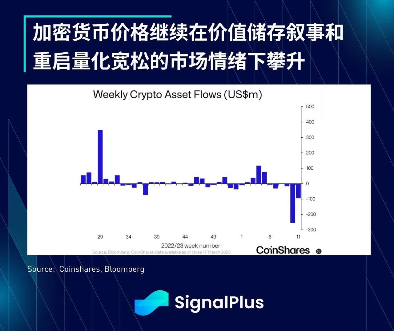 -加密貨幣價格繼續在價值儲存敘事和重啟量化寬松的市場情緒下攀升。對區域性銀行的持續支持、FDIC存款擔保上限的取消、以及美聯儲美元互換額度的最新發展,都被視作是可以很快大量提升流動性的作法。然而,我們仍持不同意見,對SVB的援助其實是一個高成本的救生索,任何流動性的支持都是以債券和股票投資者的損失作為代價,而美元互換額度的放寬有助于遏止危機跨境蔓延,使美聯儲能夠專注于其國內的政策議程。此外,加密ETF在過去2周出現大量資金流出,這與最近的價格反彈背道而馳,這可能會使加密價格與TradFi市場情緒的脫鉤進一步加劇。