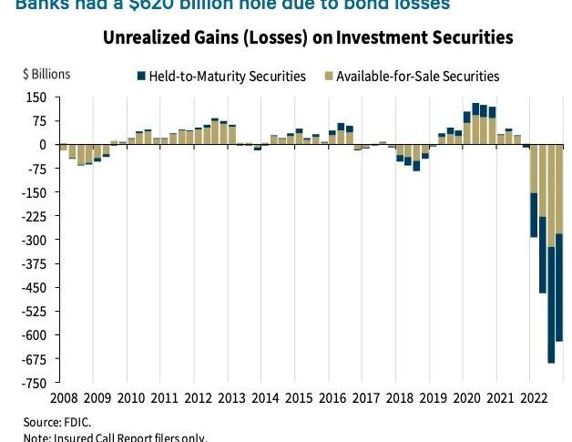 隨著存款離開小型銀行,它們不得不出售資產負債表上最具流動性的東西。美國國債和抵押貸款支持證券是非常具流動性的。然而,由于它們是在2020年和2021年購買的,在2022年底或者2023年初進行市場標價時,這些債券的價值大幅下跌。游戲結束