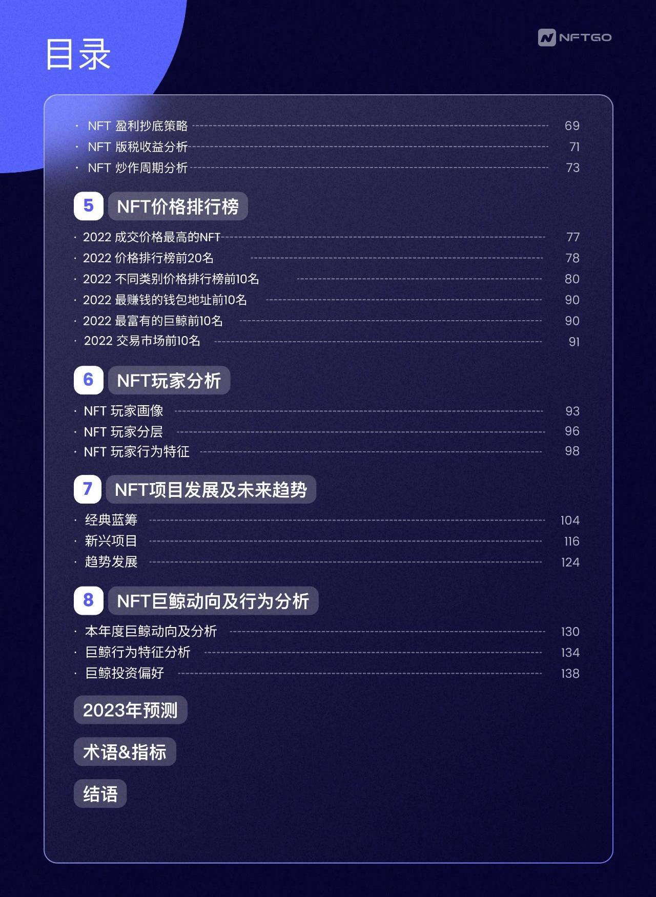 2023NFT年度報告NFTGoResearch撰寫了長達180多頁的年度報告,包含10個章節,50+多維度圖表,訪談了9位NFT資深玩家,一同探索2023年的行業趨勢。好奇誰賺走了你在NFT市場的錢?巨鯨實盤交易會采取什么策略?BAYC、Azuki等項目方如何布局未來?KOL、研究員對后市看多還是看空?哪幾種NFT更受投資人青睞?今年NFT行業比去年有哪些新變化?NFT玩家的年齡地區性別分布如何?NFT項目的發行趨勢和數量是怎樣的?哪些公鏈和NFT平臺最有潛力?NFT和ETH市場的相關性如何?下載《NFT年度報告2023》了解更多數據,目前有中英西日韓5種語言可供下載。Note:本文僅為導覽,完整版請打開此鏈接。4個趨勢