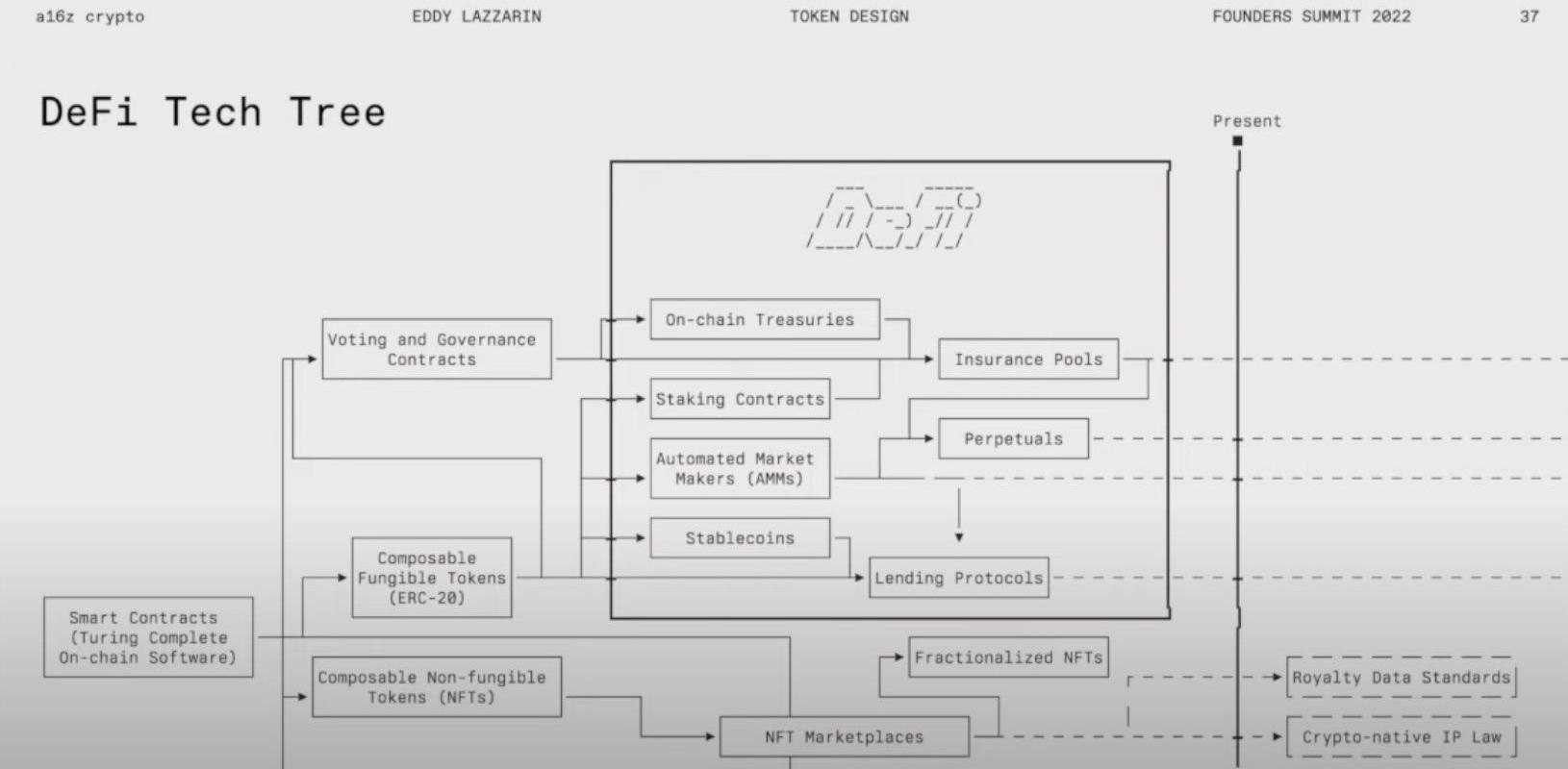 我的問題是,為什么一些產品在某些時段出現,為什么某些產品出現的時間比其他的要長?以借貸協議為例,如果沒有穩定幣,很難想象借貸協議能運作。這是因為當你在借貸協議中借出債務時,你想用穩定的資產來表示它,因為這個資產的價格你可以預測,所以我們需要穩定幣,然后才能真正有借貸協議。同樣的,我們也有需要AMM的借貸協議,因為如果你想使用借貸協議進行杠桿,特別是早期簡單的借貸協議,你需要能借入資產,比如是穩定幣。如果你想非常迅速地用該穩定幣換取該資產,你想有更多的風險敞口,那你就需要AMM。直到我們有正常運作的AMM和穩定幣,才有了借貸協議的發展。但如何獲得正常運作的AMM和穩定幣?如果沒有一個可互操作的代幣標準,就很難做到這一點,因為穩定幣、AMM和它們周圍的所有系統,需要了解其他項目如何與它們進行對接。而要想有erc20代幣,你需要完全可編程的智能合約。你可能實際并不需要它們,但這就是它們第一次在以太坊上出現的方式,因為以太坊是在沒有erc20代幣標準的情況下推出的。我們需要完全可編程性,以便能夠留下足夠開放的設計空間,當然這一點可以進一步討論。但總之,我認為存在技術樹,某些技術是其他技術的前提條件。這里有兩個問題:什么是解鎖未來的應用和協議的關鍵技術?也就是我們需要哪些技術來開發有用的信譽系統或去中心化和無信任的界面?而第二個問題有點像第一個問題反過來,哪些應用和協議將被即將到來的技術所解鎖?例如,賬戶抽象化、EIP4844、垂直樹、零知識機器學習等。這些問題之所以有趣,是因為如果我們能預見到特定科技的到來,而技術可以減輕或引入設計限制,那么這將如何改變我們的設計?如果特定的技術可以減輕限制,我們應該花精力去開發它們嗎?如果把事情看成是一棵科技樹,它可能會幫助我們推理出即將到來的東西或你所需的東西,以達到你想要的一套限制。因此,把它與我最初的限制點聯系起來,我認為新技術減輕了我們以前面臨的限制。比如,如果沒有erc20標準,那么對任何AMM或穩定幣設計的限制將是,它要么需要引入一個標準,要么能夠應對各種不同的設計。想象一下,設計一個通用的AMM,但不使用一個特定的代幣標準,這將是非常非常困難的。我認為這將是一個幾乎不可逾越的限制,但有了互操作性標準意味著,我們可以直接支持erc20代幣,這限制了設計空間,使之有可能實現。如果我們能預計未來會出現哪些技術,這對我們的協議設計的限制會有什么影響?如果我們有具體的目標,或者有具體的限制條件,那我們需要的技術是什么?技術這將能夠緩解這些限制,并通過新的機制使這些目標再次成為可能。