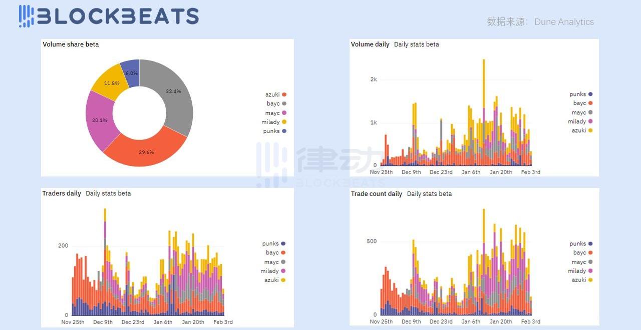 2022年11月25日nftperp啟動了beta主網,根據DuneAnalytics數據,截止發文該平臺:?累積交易量超過了7000萬美元?有1,381位用戶進行了共計21,150次交易?目前平臺僅支持對BAYC、Azuki、MAYC、CryptoPunks、Milady五個系列進行永續合約交易?交易量最大的NFT系列是BoredApeYachtClub,占32.4%的份額,其次是Azuki,占29.6%的份額路線圖