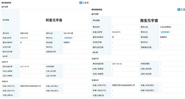 XRP/HKD-3.05%近日,天眼查顯示,阿里巴巴新加坡控股有限公司申請注冊“阿里元宇宙”“淘寶元宇宙”“釘釘元宇宙”等商標,國際分類涉及科學儀器、廣告銷售、教育娛樂等,目前商標狀態為注冊申請中。