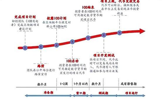 XRP/HKD-4.11%ICO是指區塊鏈項目首次代幣發行,發行的標的是比特幣、以太幣等數字代幣。2017年9月4日,中國人民銀行等七部門聯合發布了《關于防范代幣發行融資風險的公告》,將ICO定性為“一種未經批準非法公開融資的行為”,涉嫌非法發售代幣票券、非法發行證券以及非法集資、金融詐騙、傳銷等違法犯罪活動。ICO項目可簡要概括為:發行方向投資者發行項目代幣,眾籌資金,推動項目升值,從而帶動項目代幣升值后,達到賺取代幣增值后差價的目的。其流程如下圖所示: