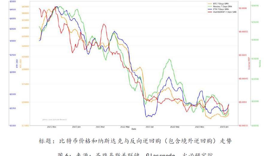 圖5捕捉了美聯儲資產負債表與逆回購的差正巧與比特幣價格同時攀升的時間段。比特幣價格進入了Wyckoff分配模型中的分配階段。無疑逆回購和風險資產呈現出了負相關,本文筆者創建了反向逆回購指標以呈現一個正向的相關性。