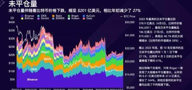 在衍生品方面,Bybit和Bitget從FTX的崩潰中獲益最多。FTX在年初還排名第三,卻自2022年11月起消失不見。Bitget的份額從3%上升到11%,Bybit的份額從8%上升到11%。Binance的主導地位從59%略微下降至58%,而OKX的第二名變得不那么穩固,其份額從20%下降至14%。令人意外的是,Binance和OKX未能從FTX手中奪取市場份額。未平倉量伴隨著比特幣價格下跌,縮至201億美元,相比年初減少了27%