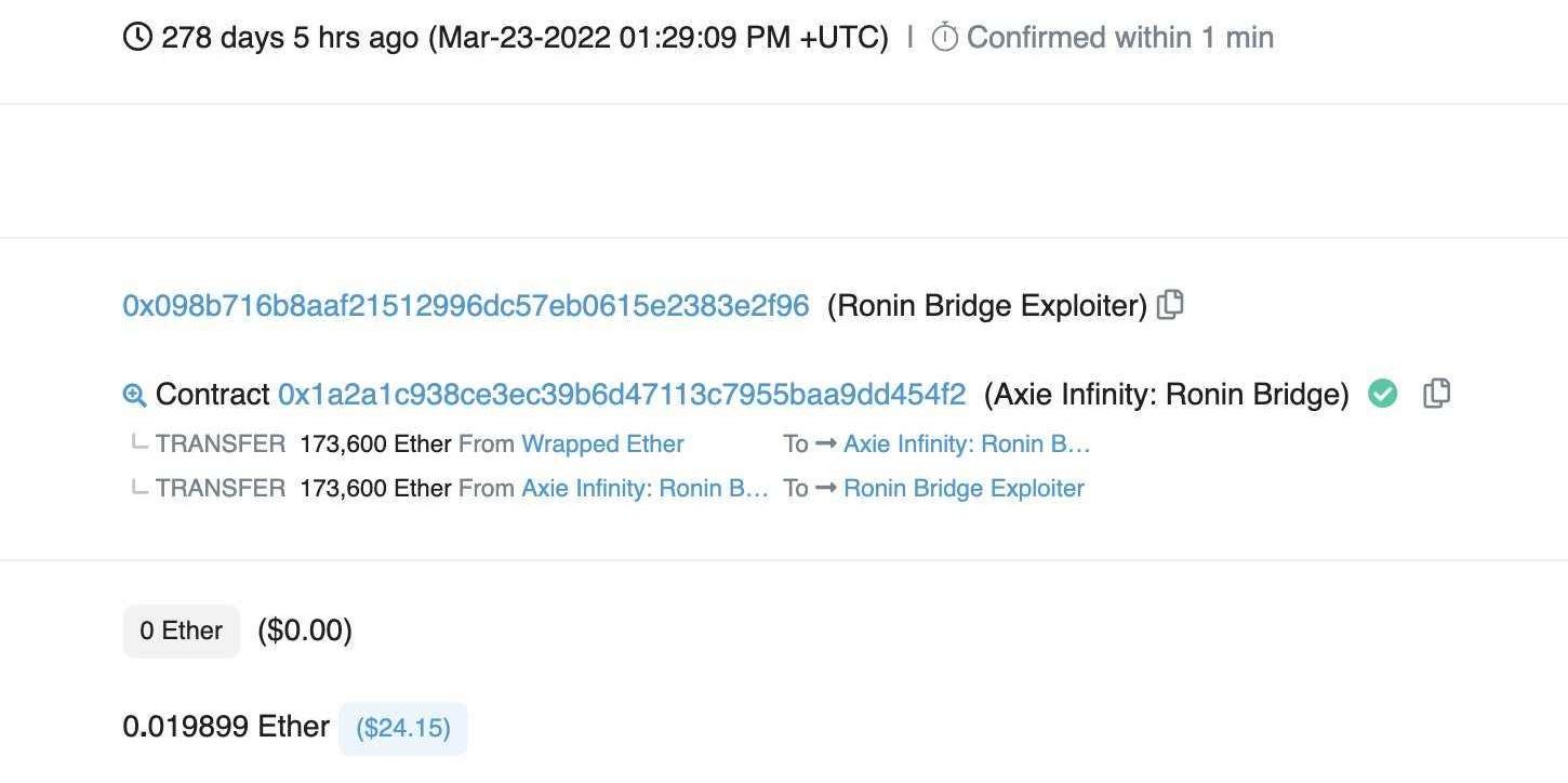 3月23日,RoninBridge遭到黑客攻擊,攻擊者通過控制九個驗證節點私鑰中的五個從而盜取大約6.5億美元資金。