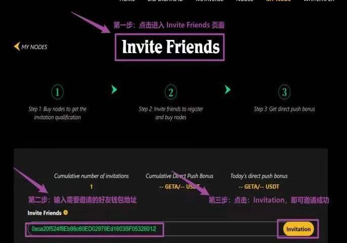 用戶購買節點界面用戶可以訪問Getaverse官網購買節點:只需要連接小狐貍錢包,進入到PurchaseNODE就能看到節點購買詳情。具體步驟如下圖。