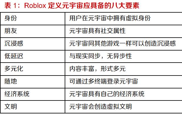 當下,元宇宙的標準大多參照 Roblox 的定義。根據元宇宙概念上市公司 Roblox 的定義,元宇宙 應具備身份、朋友、沉浸感、低延遲、多元化、隨地、經濟系統、文明等八大要素。元宇宙的表現 形式大多以游戲為起點,并逐漸整合互聯網、數字化娛樂、社交網絡等功能,長期來看甚至可以整 合社會經濟與商業活動。