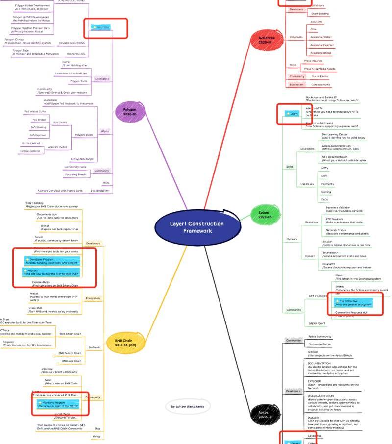 同時針對BNBChain用戶多的現象,除了我們常想到的Binance本身的流量之外,也能看到目前BNBChain不管是從開發者、生態還是社區來講都是建設的最好的。Avalanche雖然一直在聊其共識/Subnet上的創新性,但用戶量/生態一直沒起來,也許從運營角度也能看到確實有不少的不足之處。當然,公鏈的范圍也不僅僅是停留在上面的這些Layer1,還包括更多的Aleo、Mina等特殊屬性的公鏈,或者從廣義上需要開發者、自建生態的項目。公鏈類項目建設周期長,本篇文章試圖通過梳理相對頭部項目的運營模塊,探索出一些有實踐性的方法論,并對比較好的Case進行highlight分享,希望能對長期的項目建設有所幫助,歡迎DMTwitter@zolo_hands\\@linda_guagua一起交流。