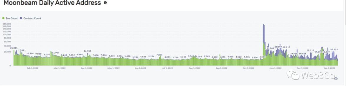 從活躍地址數據來看,開發者對于Moonbeam的熱情和用戶的鐘愛也相得益彰,根據Web3Go捕捉到的數據,Moonbeam在10月18號之后日活地址迎來了短暫的10倍增長,創下了EOA5.5萬日活,和CA近13萬日活的歷史高點,但在隨后的兩個月用戶數據出現回落,1月初EOA數據重新回落至10月中旬水平,但CA仍然保持在5000+的穩定水平。可見,開發者仍在充滿熱情地投身在波卡生態之中,不斷建設;而忠實用戶也并未因為熊市而離開Moonbeam生態,活躍一如往昔,種種跡象都表明Moonbeam仍處于早期階段,蓄勢待發,未來可期。