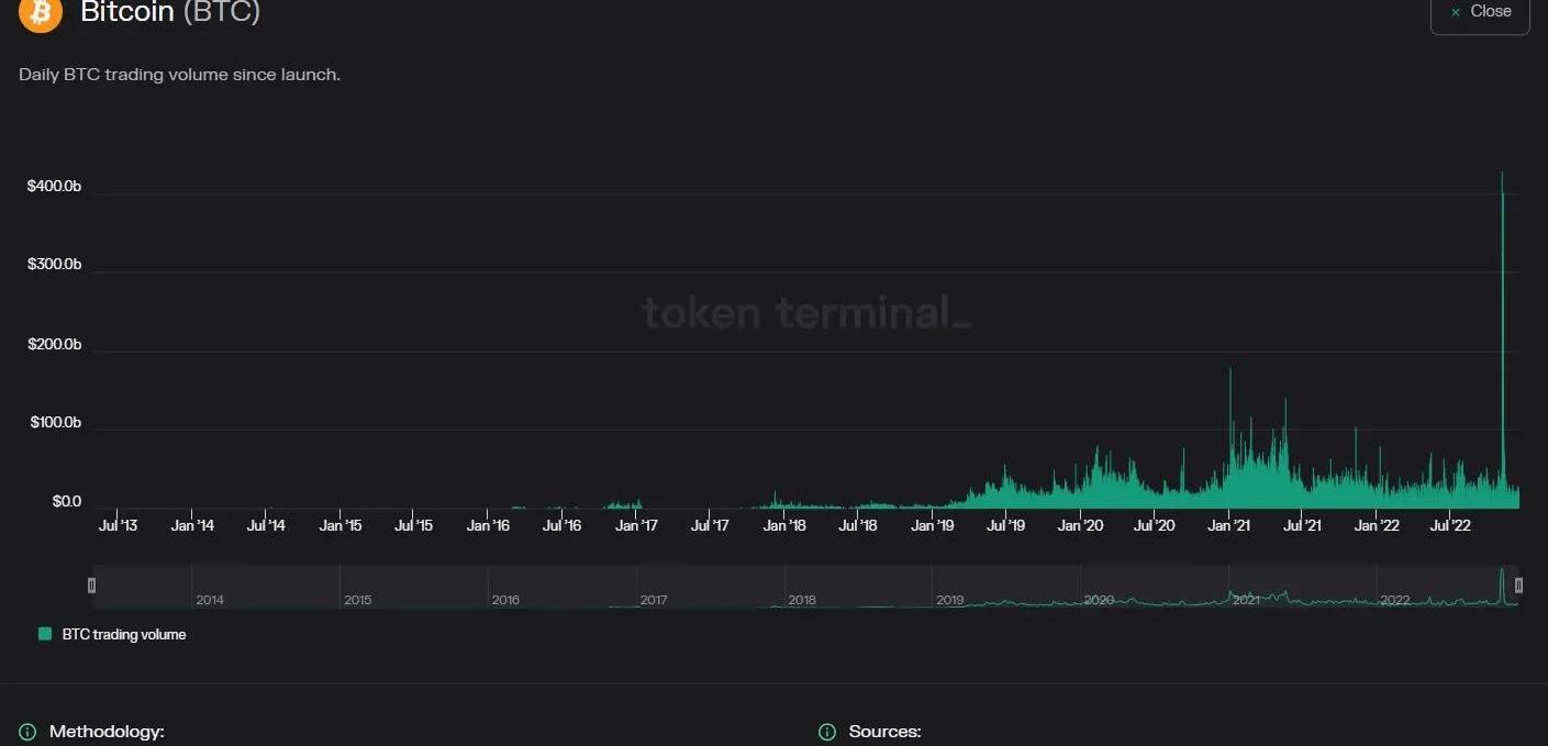 交易量大幅下降——BTC同比下降約33%,ETH同比下降52%,具體取決于當日的情況。這可能會導致未來的一些波動。我們在下圖中看到的交易量大幅飆升與FTX危機有關。