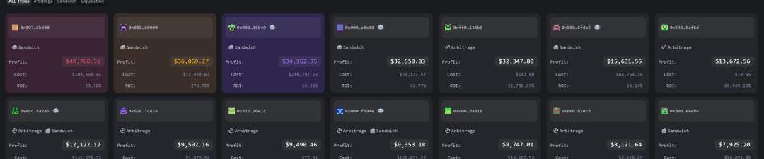 當然,厲害MEV玩家也很多。從leaderboard來看,有意思的是BSC上的MEV收入要遠高于以太坊上的MEV收入,BSC上排名第一的玩家排以$587的成本收獲了$567k,投資回報比高達90000%,讓人望塵莫及。而ETH上第一的盈利$41k,成本$103k,投資回報比只有39.7%;以太坊上MEV排名靠前的獲利者一半都是靠三明治攻擊獲利,一半是套利,套利的投資回報比往往較大,三明治的攻擊利潤較小,成本較高。