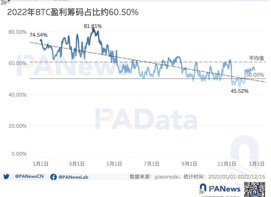 2022年市場劇烈波動造成了籌碼結構的變化。首先,從盈利籌碼分布來看,2022年比特幣盈利籌碼占比的均值為60.50%,也即全年日均有40%的籌碼處于虧損狀態。而且,盈利籌碼占比全年呈現明顯的下降趨勢,從年初的74.54%下降到了年末的55.77%,減少超18個百分點。尤其是FTX事件發生后的11月8日至11月29日期間,比特幣盈利籌碼占比幾乎始終低于50%,也即當時超過一半的代幣都處于虧損狀態。