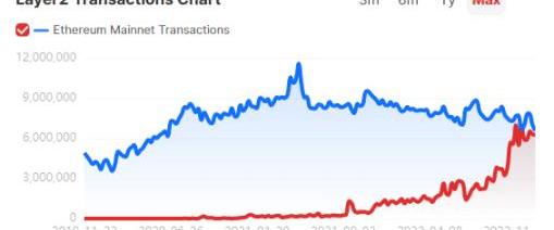 cr:l2beat.com/scaling/tvlL2上的用戶交互活躍度逐漸與以太坊主網持平,以下圖表來自OrbiterFinanceL2Data:藍線表示以太坊主網交易數量,紅線表示L2交易數量。