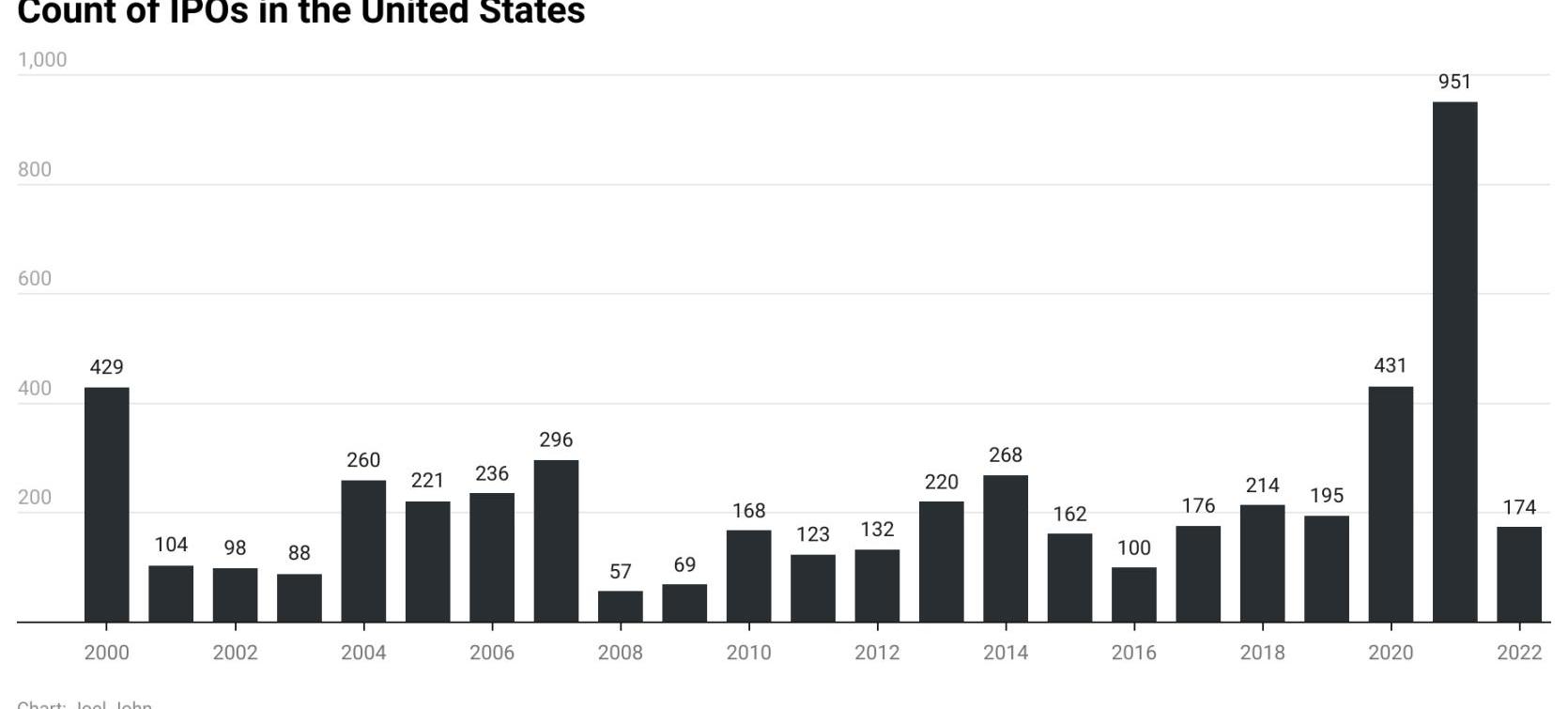 當然,我的朋友們每天早上在廁所里購買字面上的垃圾幣并不是數字資產成長為數萬億美元產業的唯一原因。機構在這個等式中發揮作用。讓我們以風險投資為基準。在今天的美國,一家公司平均需要七年時間才能實現流動性,從種子資金到上市公司退出。在互聯網泡沫期間,這個時間縮短為三年。軟銀或老虎環球等大型基金的到來改變了風險投資作為一種資產類別的發展軌跡。公司在更短的時間內被「重新定價」為成長階段的公司,只要他們能表現出一定的吸引力。風險投資支持燒錢的初創公司并不是什么新鮮事,但在過去兩年中,它發生的速度要快得多。當你投資的每家公司都可以在六到八個月內進行融資時,你的工作就不再是挑選中獎號碼,而是購買盡可能多的彩票。反過來,大型基金有動用大量資金的能力。如果一個基金管理10億美元,部署1000萬美元只是該基金的1%。當過剩資本追逐數量有限的初創企業時,隨之而來的是估值上升。OpenSea在私人市場上一個周期的估值為130億美元,或者MoonPay的估值為34億美元。如果對公開市場進行比較:Coinbase的市值為100億美元,PayTM市值38億美元。Coinbase和PayTM的價值是否低于OpenSea和Moonpay?我不知道。但是可能有一種心理作用:只要有一個健康的公開市場可供退出,以更高的估值部署更多的資金就可以了。公開市場是私人投資者認為初創企業最終可以走向何方的基準。假設我看到一家上市公司估值為100美元,而一家處于早期階段的相關參與者估值為1美元。上市后,它的價值可以翻上100倍。自然,早期投資者只會進行少量投資。假設你下了10次賭注,每次10美元,其中一次標的達到100美元,你整體的賭注就贏了,并可以獲得了豐厚的回報。。但當公開市場估值與私人市場估值趨于一致時,情況就發生了變化。還記得我在上文所說的歷史數據如何幫助我們定價嗎?每當像WeWork或BeyondMeat這樣的公司進入公開市場時,公司的價值都有先例。這意味著一旦公司上市,估值將重置為更現實的數字。因此,一旦公司在衰退的市場上市,資本配置者就可以做出選擇。你是否將資金投入流動性差的早期風險投資,或像軟銀在2020年第三季度所做的那樣直接在公開市場上購買?