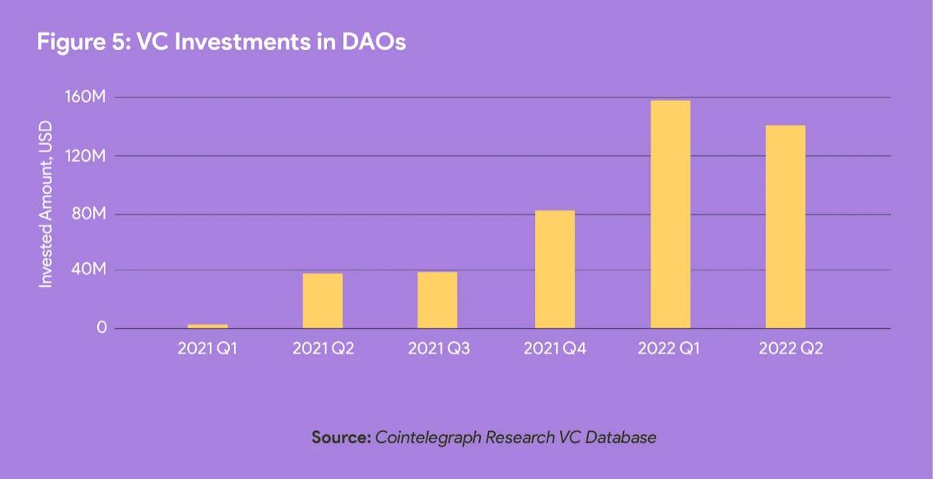 DAO的風險投資(VC)方面有兩個組成部分:VC對DAO的投資和VCDAO本身。自2021年以來,參與資助DAO項目的風險資本一直在增加,經常與宏觀經濟和加密貨幣市場周期相吻合。據報道,風險投資在2022年第一季度達到了超過1.6億美元的局部峰值。