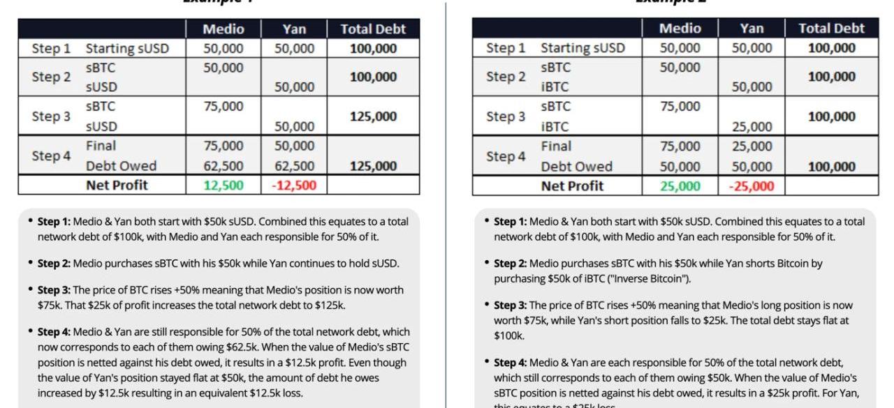 Example1Step1:Medio和Yan的初始投資金額均為5萬美元,網絡的總債務加起來等于10萬美元。其中Medio和Yan分別承擔了其中的50%。Step2:Medio用他的5萬美元購買了sBTC,而Yan則繼續持有sUSD。Step3:BTC的價格上漲了50%,這意味著Medio的持倉價值變為7.5萬美元,其中2.5萬美元的利潤讓網絡的總債務達到了12.5萬美元。Step4:Medio和Yan仍然各承擔網絡總債務的50%,即每人6.25萬美元。當Medio的sBTC的價值減去他的債務,可獲利1.25萬美元;即使Yan的倉位價值為5萬美元,但他的債務增加了1.25萬美元,即為1.25萬美元的損失。上述行為,盡管Yan沒有進行任何操作,但由于Medio的操作讓網絡的總債務達到了12.5萬美元,提高了Yan的債務風險敞口,因此白白承擔了1.25萬美元的損失。HedgingStrategy由上述示例我們可以看出,作為質押人,可能存在“別人賺錢我虧錢”的風險,一般來說,質押人需要根據債務池做好倉位管理和對沖。