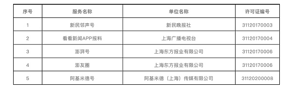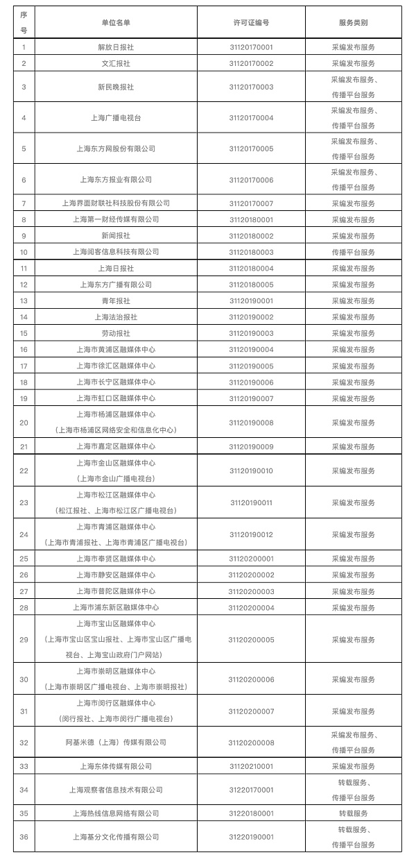 另,上海屬地內的上海觀察者信息技術有限公司、上海基分文化傳播有限公司由國家互聯網信息辦公室頒發《互聯網新聞信息服務許可證》,準許其從事互聯網新聞信息轉載、傳播平臺服務。上海熱線信息網絡有限公司由國家互聯網信息辦公室頒發《互聯網新聞信息服務許可證》,準許其從事互聯網新聞信息轉載服務。