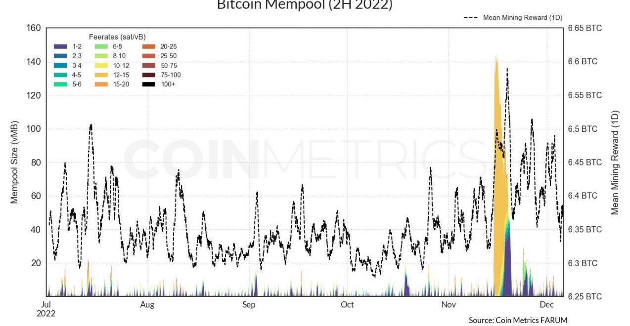 到2022年下半年,除了11月中旬的長時間擁堵外,內存池一直保持相對平靜。大量12-15sat/vB交易導致平均挖礦獎勵大幅飆升,F2Pool單個區塊凈賺了超過0.73BTC的交易費用。