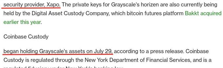 在分析該事件之前,我們需要從一個起點入手,就是Coindesk文章中指出的具體信息:大多數資產正在從Grayscale現有的安全提供商XAPO轉移到CoinbaseCustody。目前,Coinbase的Horizen的私鑰也由DigitalAssetCustody持有,該公司是比特幣期貨平臺Bakkt今年早些時候收購的。據新聞稿稱,CoinbaseCustody于2019年7月29日開始持有Grayscale的資產。CoinbaseCustody由紐約金融服務部監管,是紐約銀行法規定的受監管受托人。