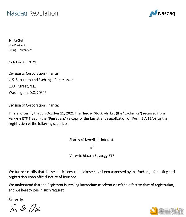 無獨有偶,2021年10月15日,納斯達克向美國SEC發函督促美國SEC加快放行比特幣ETF。在信函中,納斯達克表示收到了Valkyrie比特幣策略ETF(Valkyrie Bitcoin Strategy ETF)的注冊申請副本,而且上述ETF已獲本交易所批準上市和登記。納斯達克進一步公開表示,注冊人正在尋求立即加快注冊生效日期,納斯達克加入此請求,希望美國SEC加快放行比特幣ETF。