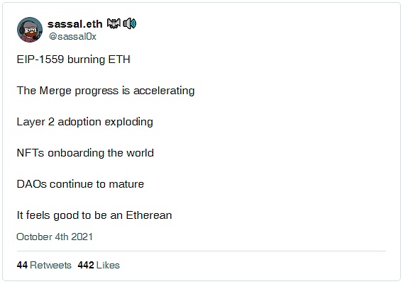 作為一個從 2017 年初就一直在以太坊生態圈的人,我可以肯定地說,我從來沒有像今天這樣對以太坊的未來如此樂觀。經過多年的努力,我們正在看到以太坊 L1 方面 (EIP-1559 和其他主要的升級)、L2 方面 (Rollups 正大步前進) 以及應用層方面 (DeFi、NFTs、DAOs 等等) 的成果。我們正處于以太坊的黃金時代。