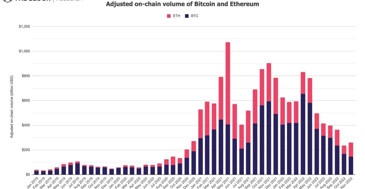 XRP/HKD-1.05%剛剛過去的11月,加密市場幾乎被FTX和AlamedaResearch的暴雷事件“主導”,整個行業開始去風險化,投資者也開始將加密貨幣從交易所取出并進行自我托管。在這些趨勢推動下,加密市場發生了哪些變化呢?讓我們用12張圖來進行深入解讀。1、11月加密市場調整后鏈上總交易額有所增長,達到2600億美元,增幅為9.9%,其中比特幣鏈上交易額下降了13.1%,以太坊鏈上交易額上漲了66.7%。
