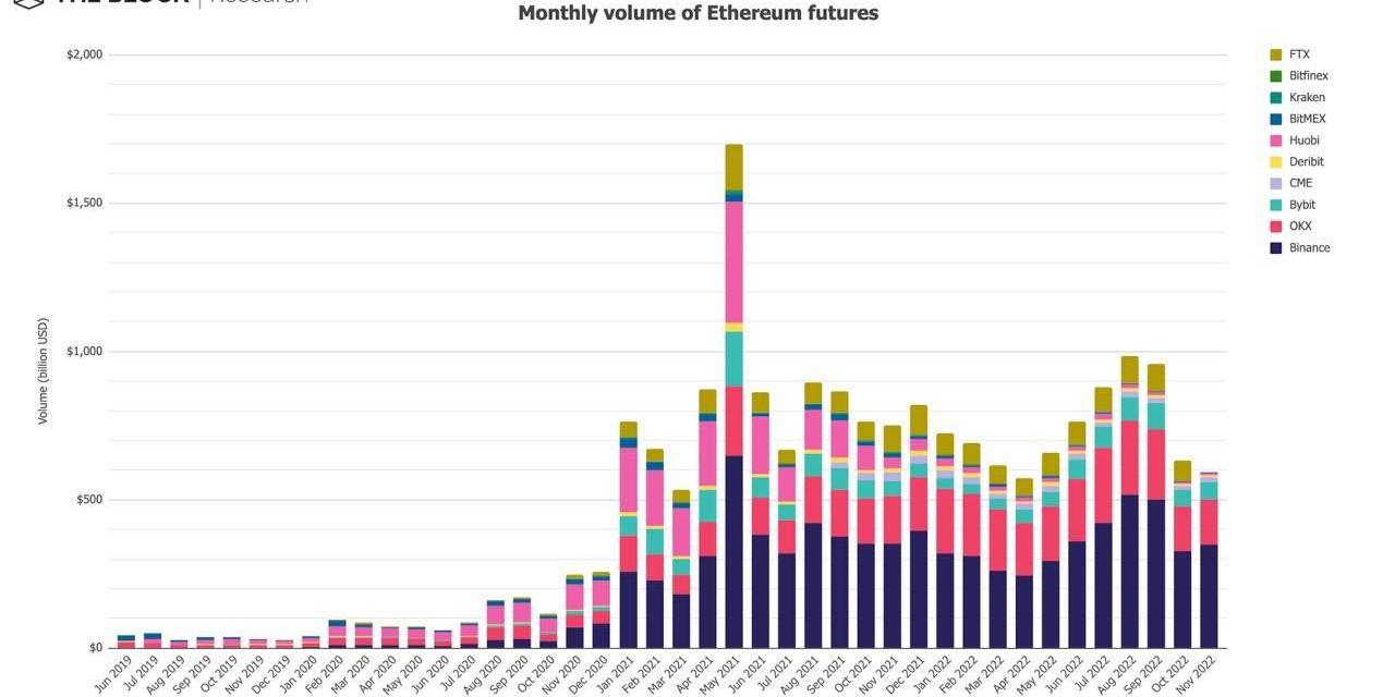 11、11月以太坊期貨月交易額下跌6%,跌至5930億美元。