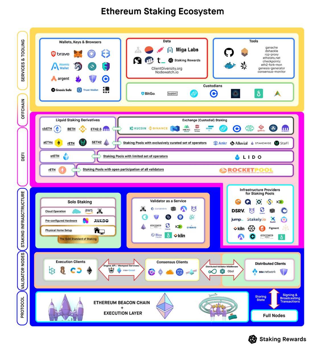 借用一張StakingRewards做的很詳細的圖,看起來很復雜,但實際上真正需要關注的東西沒有那么多。質押參與方式可分為三種:SoloStaking:簡單來說自己運行共識客戶端和執行客戶端,質押32個ETH成為驗證者,好處是能獲得全額獎勵,壞處是各種罰沒風險。Stakingasaservice:會有專門做質押服務的服務商為你搭建客戶端,相應大幅降低了被罰沒風險。但是服務商會收費,并且需要信任假設因為要把私鑰交給質押服務商,同樣需要32個ETH。PooledStaking:基本什么都不需要你做,ETH也不需要32個,最低大概0.01個ETH也可以,并且這是唯一可隨時退出的方式因為PoolStaking都會給用戶1:1的衍生代幣。但這里除了信任假設以外,還存在智能合約風險因為PoolStaking大多是鏈上項目,其次也是要收費,質押服務商要收費,流動性服務也要收費。具體信息可以在以太坊官方staking頁面查看,選擇適合自己的方案。說回上面那張圖,SoloStaking里比如亞馬遜云大多都并非Crypto項目,也不會發行Token;VAAS同樣,大多屬于基礎設施行列也并不發行Token。而StakingPool則是我們需要關注的東西。上圖的最上一行Service&Tooling包括錢包,數據分析等工具,不僅限于質押賽道。下一行Defi流動性質押,比如去中心化的Lido和中心化的CEX,都會給你1:1的衍生代幣釋放流動性。后面StakingInfrastructure里是SakingPool的基礎設施或者說硬件,大多也不發行Token。節點服務里面SSV下面會提到。所以整張圖需要關注到的質押賽道項目基本就是StakingPool外加一個SSV。4.質押賽道項目