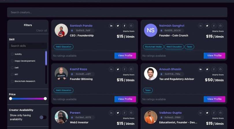 Soclly自稱是一個由Lens協議提供支持的的、以創作者為中心且專注于社區去中心化社網絡。創作者或者資深人士在平臺上完成注冊后可以添加自己的技能和經驗,以及設置可用時段和費用,然后幫助其他人解決問題。請求者可以去預約選定創作者的時間,預約時需要付費,預約成功過資金就會轉入創作者錢包,之后就可以在約定的時間與創作者進行會議。Soclly上的通信由開源隱私Web會議應用Jitsi提供支持。結合Soclly應用功能來看,Soclly更像是一個針對創作者或資深人士的時間出售和知識分享項目,給予普通用戶一個與創作者深度溝通交流的機會,同時創作者也能從中賺取收益。Soclly當前版本尚不支持連接Lens,之后發布新版本后將支持LensProfile。