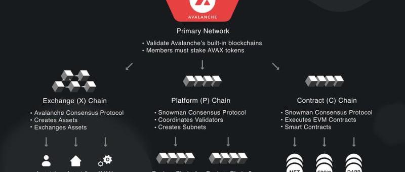 Avalanche的主網由三個主要的鏈組成:平臺鏈、合約鏈和交易鏈:P-Chain使用雪人共識協議來協調驗證者并創建子網。C-Chain負責創建和執行與EVM兼容的智能合約。X-Chain使用AvalancheDAG共識來創建、管理和交換資產和代幣。P-Chain、C-Chain和X-Chain就像Avalanche的三個火槍手。