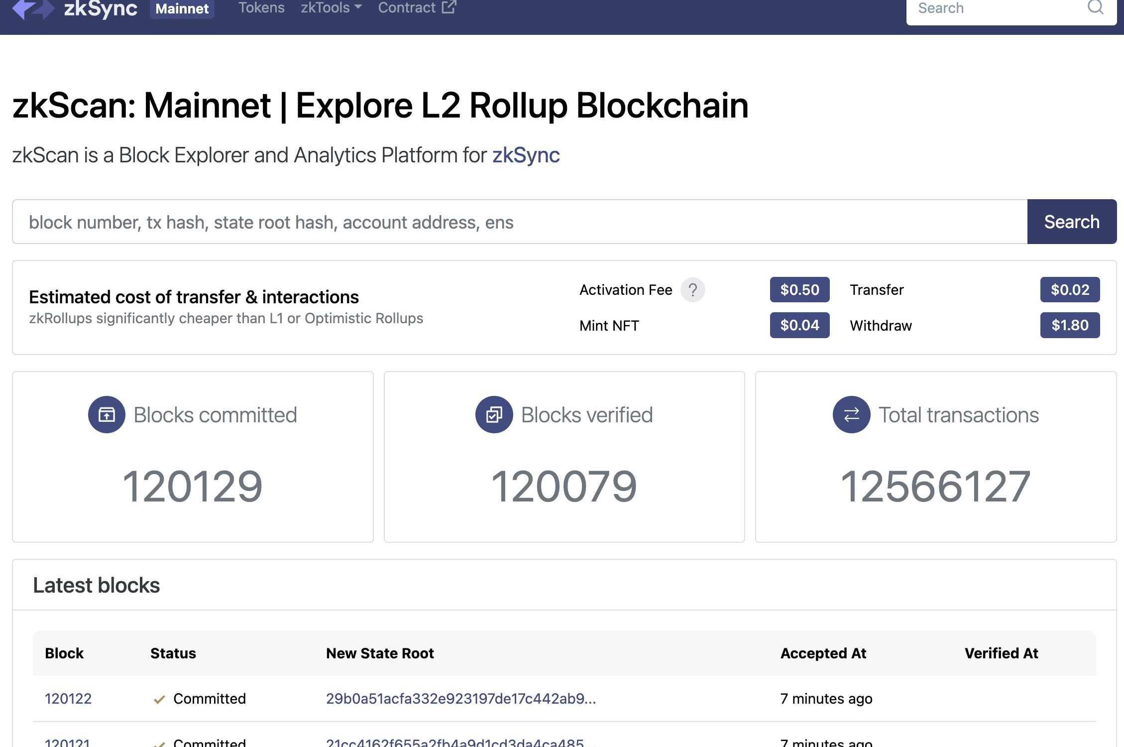 目前zkSync的官方瀏覽器為zkcsan,目前可以顯示zkSync1.0中的交易信息。