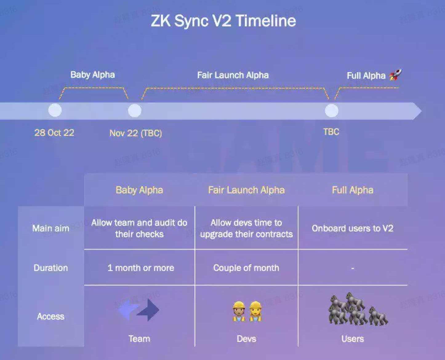 很遺憾,暫時還不能。根據zkSync團隊的官方路線圖,將于10月28日上線的zkSync2.0主網將只對團隊內容開放,主要用于對其進行進一步測試與審計,該階段被稱為BabyAlpha,預計將持續一個月時間。之后在11月下旬,將會進入到FairLaunchAlpha階段。在該階段團隊將會開放生態開發者的項目部署權限,以便開發者能夠測試并升級其合約,該階段預期會持續幾個月時間。然后在明年的上半年,才會推進到FullAlpha階段。屆時普通用戶才能真正在zkSync2.0上體驗其產品。具體時間規劃可見下方示意圖。