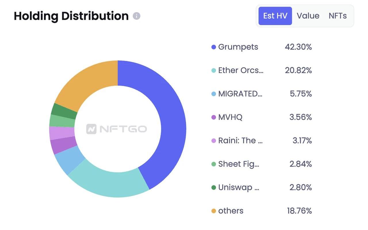 Twitter:@GriffdenNFTAddress:0x2ea4815f47d685ed317e8bd243b89bcb26b369faFlipTimes:1956FlipsRatio:52%HoldingValue:90ETHNFTs:2114PnL:456ETHNFTGoProfile:https://nftgo.io/account/ETH/0x2ea4815f47d685ed317e8bd243b89bcb26b369fa/NFT在該地址持有的所有NFT中,EstHoldingValue最多的是SappySeals,占據了12.61%。除此之外,Griffden還持有較多ArtBlocks以及Acrocalypse。其中Acrocalypse不僅是一個PFP收藏品,也是paperhands.gg的生態系統NFT,擁有該NFT可以執行整個Acrocalypsegalaxy的任務。