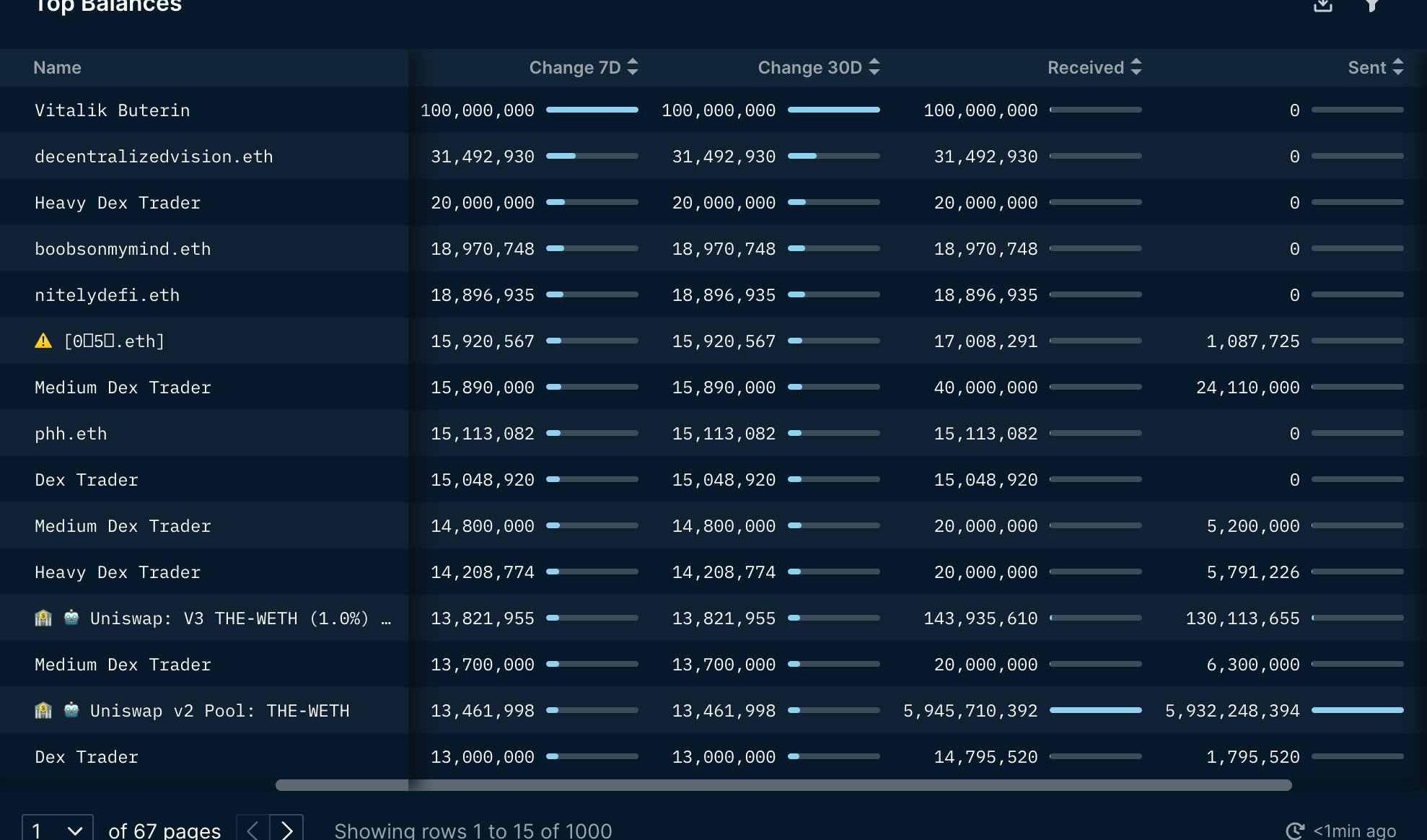 目前THE最大巨鯨是V神本人,他共計收到1億枚THE,占總供應量的10%。前50個非實體地址持有THE總數占比50.6%,其中大多數地址反應極其迅速,項目一發布立刻買入。decentralizedvision.eth以每枚THE0.00028美元的價格將3枚ETH換成13,614,311枚THE。