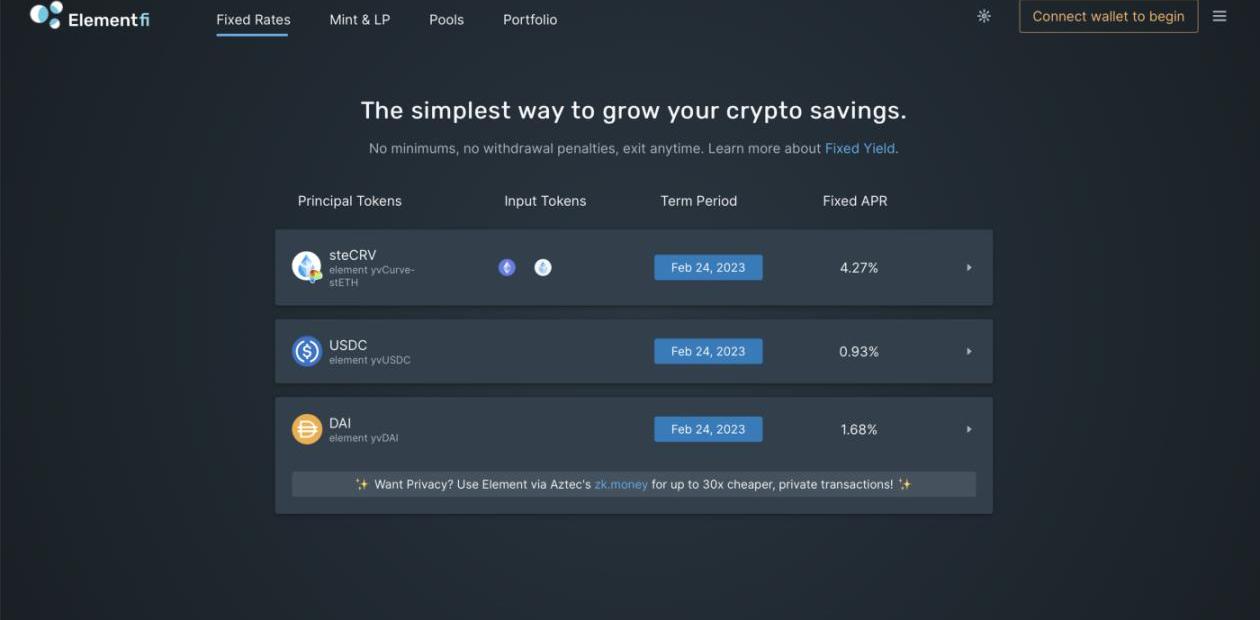 Alchemix是一種創新的混合DeFi應用程序,允許創建收益支持的合成資產。憑借其提供抵押品的獨特能力,Alchemix可以提供實際上沒有清算風險的自付貸款。Alchemix正在為他們的合約開發ERC-4626適配器,以便他們可以使用ERC-4626金庫作為新的收益來源。ElementFinance