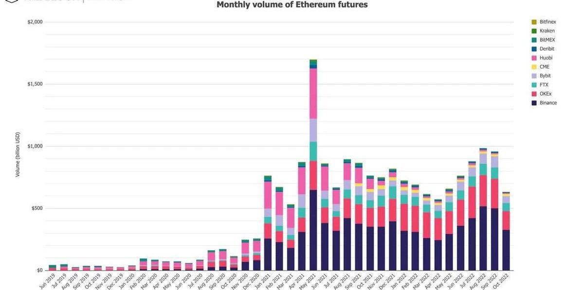 至于ETH期貨,月交易量下降34.2%至6310億美元: