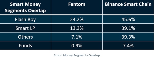 從圖中,我們看到Flash Boys(在一次交易中進行過多次dex交易,且本質上是盈利的錢包)在Fantom和Ethereum上的重疊度最大(24.2%)。更不用說智能LPs、其他人和基金的重疊率分別為13.3%、7.1%和0.9%。