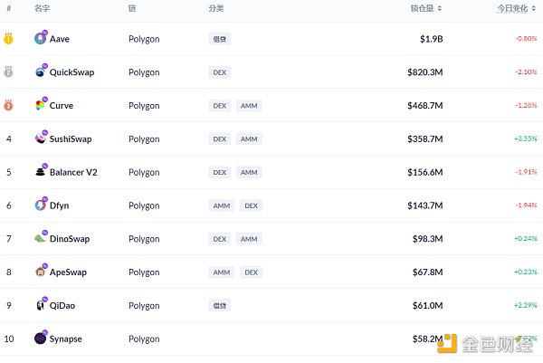 Polygon鏈上DeFi鎖定資產前十排名及鎖倉量,數據來源:Debank