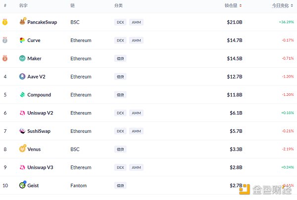 BSC鏈上DeFi鎖定資產前十排名及鎖倉量,數據來源:Debank