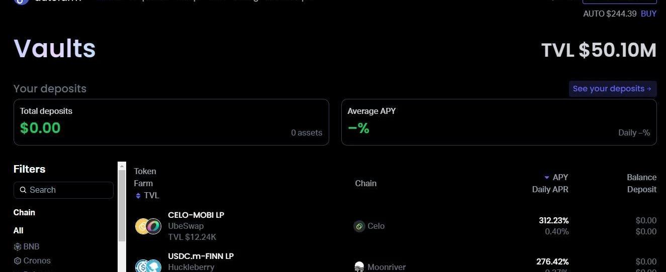AutoSwapPage主要產品也是保險庫。投資者可以使用過濾器按APY選擇鏈、資產和訂單。