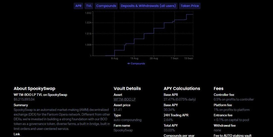 BeefyFinanceVaultselection保險庫可以按鏈,資產類型,以及APY,每日回報率,TVL和安全評分來過濾篩選。單擊任何保管庫時,會顯示概覽頁面。
