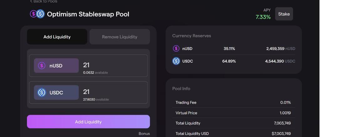 任務:流動池(LP)中存入價值20美元的ETH或穩定幣。難度:★☆☆☆☆時間:立刻完成點評:筆者選擇了nUSD-USDC交易對。
