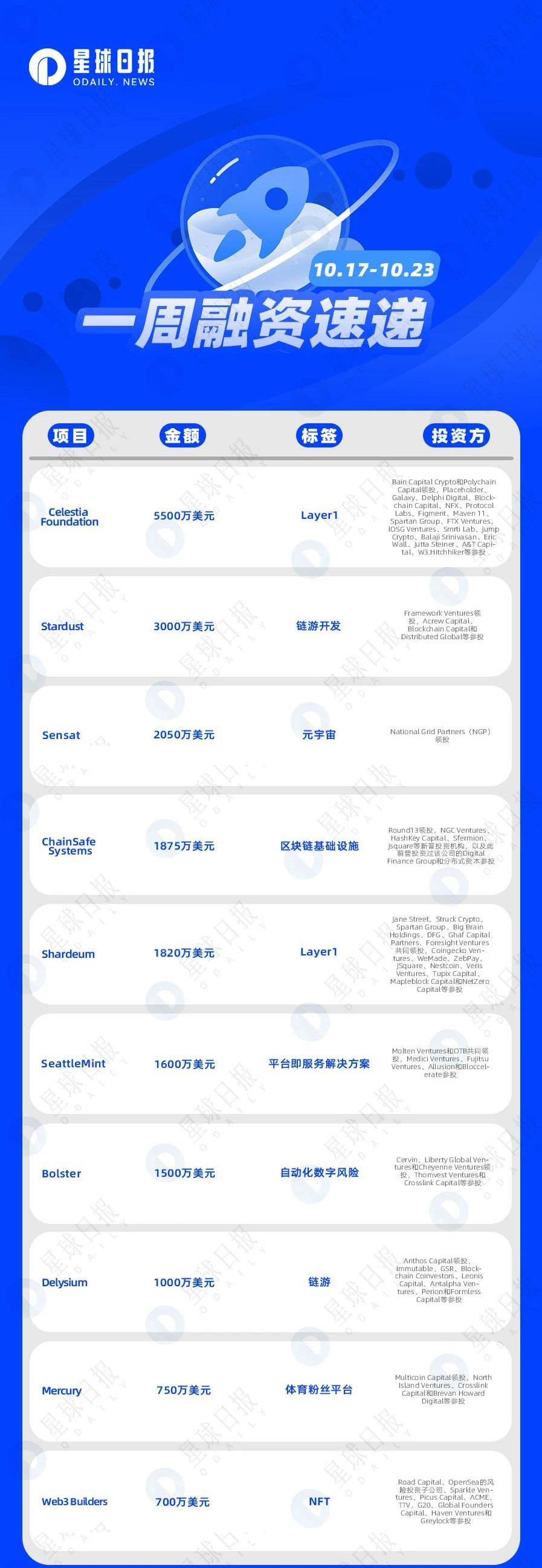 以下為具體融資事件:模塊化區塊鏈網絡Celestia完成5500萬美元融資,PolychainCapital等領投10月20日,CelestiaFoundation宣布完成5500萬美元融資,BainCapitalCrypto和PolychainCapital領投,Placeholder、Galaxy、DelphiDigital、BlockchainCapital、NFX、ProtocolLabs、Figment、Maven11、SpartanGroup、FTXVentures、IOSGVentures、SmrtiLab、JumpCrypto、BalajiSrinivasan、EricWall、JuttaSteiner、A&TCapital、W3.Hitchhiker等參投。據悉,Celestia引入模塊化區塊鏈架構來解決部署和擴展區塊鏈的挑戰。目前Eclipse、Constellation和dYmension等模塊化區塊鏈項目已選擇Celestia作為其數據可用性層。Celestia于今年5月推出其測試網Mamaki,引入一個新的數據可用性API。Mamaki的升級計劃于2022年10月下旬進行。鏈游開發者工具公司Stardust完成3000萬美元A輪融資,FrameworkVentures領投10月19日,為鏈游提供開發者工具的公司Stardust完成3000萬美元A輪融資,FrameworkVentures領投,AcrewCapital、BlockchainCapital和DistributedGlobal等參投。Stardust總部位于加利福尼亞州,由首席執行官CanaanLinder于2018年創立。Stardust已經與游戲發行商TiltingPoint合作,幫助其開發人員構建區塊鏈游戲。元宇宙“數字孿生”軟件公司Sensat完成2050萬美元B輪融資,NGP領投10月21日,總部位于倫敦的元宇宙“數字孿生”軟件公司Sensat宣布完成2050萬美元B輪融資,英國跨國能源巨頭NationalGrid旗下投資部門NationalGridPartners領投。據悉,Sensat曾在2019年完成1000萬美元A輪融資,當時領投方為騰訊。截至目前,該公司的融資總金額約為3550萬美元。Sensat為建筑、采礦、能源和類似行業提供“復制”現實世界的工具,與蓬勃發展的元宇宙市場相呼應,據稱現階段其商業化實施程度領先于Meta。區塊鏈基礎設施公司ChainSafeSystems完成1875萬美元A輪融資,Round13領投10月18日,區塊鏈基礎設施公司ChainSafeSystems宣布完成1875萬美元A輪融資,Round13領投,NGCVentures、HashKeyCapital、Sfermion、Jsquare等新晉投資機構,以及此前曾投資過該公司的DigitalFinanceGroup和分布式資本參投。本輪融資完成后,Round13執行合伙人KhaledVerjee和以太坊聯合創始人JosephLubin將加入ChainSafe公司董事會。該公司表示,作為以太坊、Polkadot、Filecoin和其他領先區塊鏈生態系統的核心協議開發商,他們將繼續專注于基礎設施開發和Web3游戲市場,并利用新資金支Web3生態系統的采用和可持續發展。Layer1區塊鏈Shardeum完成1820萬美元種子輪融資,JaneStreet等領投10月18日,WazirX聯合創始人兼CEONischalShetty創立的Layer1區塊鏈Shardeum宣布完成1820萬美元種子輪融資,JaneStreet、StruckCrypto、SpartanGroup、BigBrainHoldings、DFG、GhafCapitalPartners、ForesightVentures共同領投,CoingeckoVentures、WeMade、ZebPay、JSquare、Nestcoin、VerisVentures、TupixCapital、MapleblockCapital和NetZeroCapital等參投。據悉,所籌資金將用于加強公司的營銷以及發展開發團隊,以進一步加強Shardeum的動態分片技術和生態系統發展。NischalShetty表示,Shardeum增加了每秒交易量(TPS)和網絡的總容量以進行擴展,并確保即使交易量增長也能降低交易費用。SeattleMint完成1600萬美元A輪融資,MoltenVentures和OTB共同領投10月17日,區塊鏈平臺即服務解決方案提供商SeattleMint宣布完成1600萬美元A輪融資,由MoltenVentures和OTB共同領投,MediciVentures、FujitsuVentures、Allusion和Bloccelerate參投。該筆融資將用于平臺改進,通過進一步加強其低代碼產品,鞏固其在歐洲、MEA、印度和新加坡的地位,并加快向日本市場的擴張,以滿足客戶的要求。據悉,SettleMint是一個用于區塊鏈應用程序開發的低代碼平臺,使工程團隊能夠在web3基礎架構上構建、集成和啟動應用程序。SettleMint提供部署環境、開發、中間件環境和集成工作室,所有這些都可以通過Internet獲得。自動化數字風險保護公司Bolster完成1500萬美元融資,Cervin、Liberty等領投10月19日,自動化數字風險保護公司Bolster完成1500萬美元融資,由Cervin、LibertyGlobalVentures和CheyenneVentures領投,ThomvestVentures和CrosslinkCapital等參投。該筆融資,將推動公司進一步發展,以幫助更多全球客戶檢測和修復網絡、社交媒體和應用商店中的威脅。據悉,Bolster可以自動檢測并快速修復數字媒體和Web3網絡中的威脅,監控和打擊互聯網上的欺詐者,可在跨網絡、社交媒體、應用商店提供最有效的保護,以打擊欺詐性網站和內容。Web3游戲Delysium完成1000萬美元戰略融資,AnthosCapital領投,Immutable等參投10月17日,Web3MMO游戲Delysium宣布完成1000萬美元戰略融資,AnthosCapital領投,Immutable、GSR、BlockchainCoinvestors、LeonisCapital、AntalphaVentures、Perion和FormlessCapital等參投。戰略資金將主要用于開發內容,實現獨特的人工智能體驗,并構建Web3游戲的開源和去中心化發布結構DelysiumMultiverse。此前報道,今年年初,Delysium宣布完成超400萬美元的首輪融資,GalaxyInteractive、RepublicCrypto、AlamedaResearch領投。據悉,Delysium由Y-Combinator孵化的游戲-AI公司rctAI主導建設,希望通過打造"FuntoPlay,PlayandEarn"的高品質游戲體驗和持續運轉經濟系統以探索web3game行業的未來。自Delysium于5月1號啟動Pre-Alpha測試以來,已有超過5000名玩家參與測試。開發團隊通過與社區進行密切溝通反饋,與玩家共建共創的方式快速迭代了數個版本,并即將開啟首個正式賽季。目前,游戲在官網提供PC和云游戲兩個版本。體育粉絲平臺Mercury完成750萬美元種子輪融資,MulticoinCapital領投10月20日,體育粉絲平臺Mercury完成750萬美元種子輪融資,MulticoinCapital領投,NorthIslandVentures、Crosslink