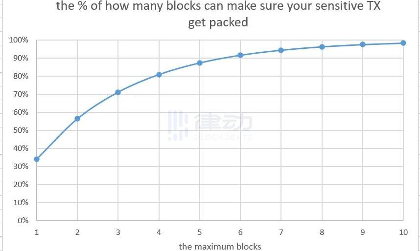 讓我們以TornadoCash為例。如果美國法規要求2/3的礦池禁止一筆交易,那么與Tornado相關的交易上鏈就需要更長的時間。過去大概需要12秒,但未來可能需要30多秒,如果運氣不好,甚至可能需要一兩分鐘。從下面這條曲線可以看出,連續禁止一筆交易1分鐘的概率約為7%,這有點令人失望。