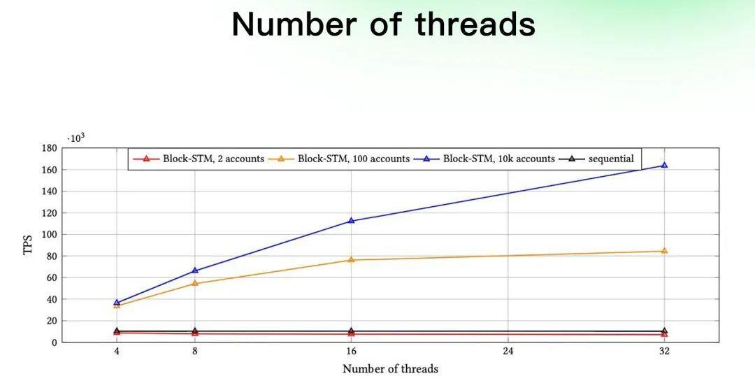 批量處理:在交易傳播過程中,交易被每個驗證者分組為批次,而在共識過程中,批次被合并為區塊。連續的交易廣播:交易的傳播和共識脫鉤,驗證節點不斷的將分組后的批次發送給其他驗證節點。交易排序和交易執行:這一步實際是通過DiemBFTV4實現共識的過程,領導驗證者會提議對區塊進行狀態更新,將狀態增量和包含已被認證區塊狀態發送給其他驗證節點,其他驗證節點決定是否投票,如果投票,則可以直接進行計算和執行,不再需要等待共識完成。Aptos通過Block-STM并行執行引擎來管理事務的執行,這是一個樂觀的并發控制,其性能測試如下:可以看到在10k個賬戶競爭的情況下,32線程情況下可以達到16w的TPS,并行執行的優勢在大量賬戶的競爭交易空間時得到體現。