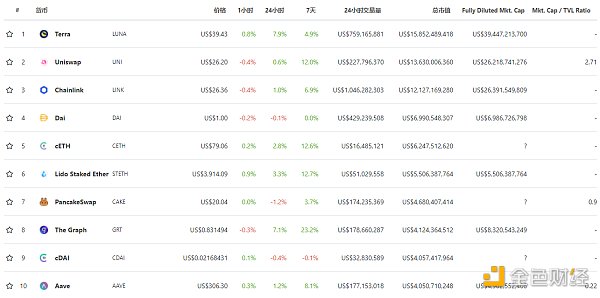 DeFi項目鎖定資產前十排名及鎖倉量,數據來源:Debank