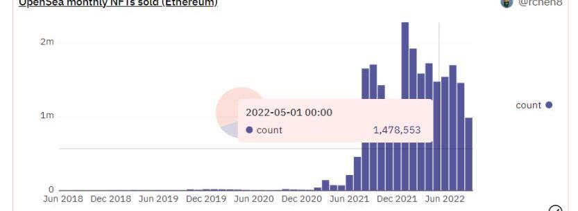 XRP/HKD-2.54%2021年是NFT的元年,NFT市場在2022初達到48億美金的交易量頂峰,于今年6月出現斷崖式下滑opensea月交易量僅6.9億美金。不論是NFT玩家通過社區的反饋還是分析師通過對鏈上數據進行分析,都紛紛表示NFT寒冬將至。通過參考opensea上的NFT每月售出NFT的數量來看,3月以后的NFT市場月交易總頻次并未發生像交易量萎縮同等幅度的變化。