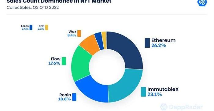 從2022年第三季度的鏈上銷售數量來看,情況有所不同,以太坊仍然是主導鏈,但僅占總銷售量的26.22%。從交易額和交易量之間的明顯差異可以看出,以太坊可能更多地吸引了部分“高端巨鯨級買家”,而其他區塊鏈則受到中小交易者的青睞。